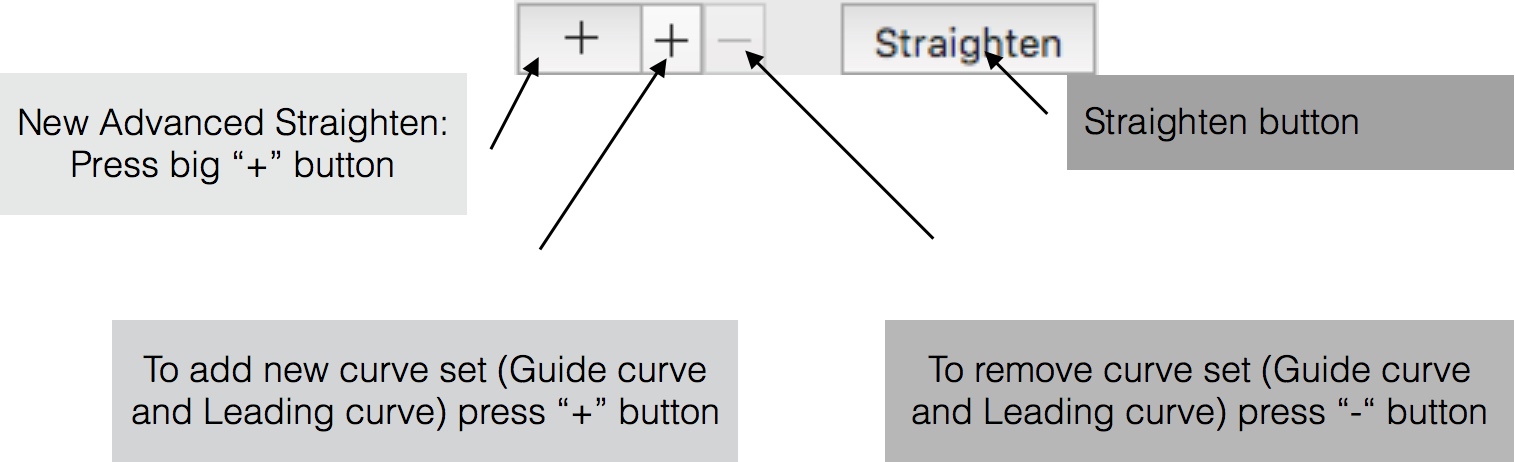 Advanced Vertical Straighten and Advanced Horizontal Straighten are new tools developed to allow user to influence how straighten will be performed. This means that the user chooses what will be straightened by Guide curves. With Leading curves, the user arranges how the straighten will be performed.